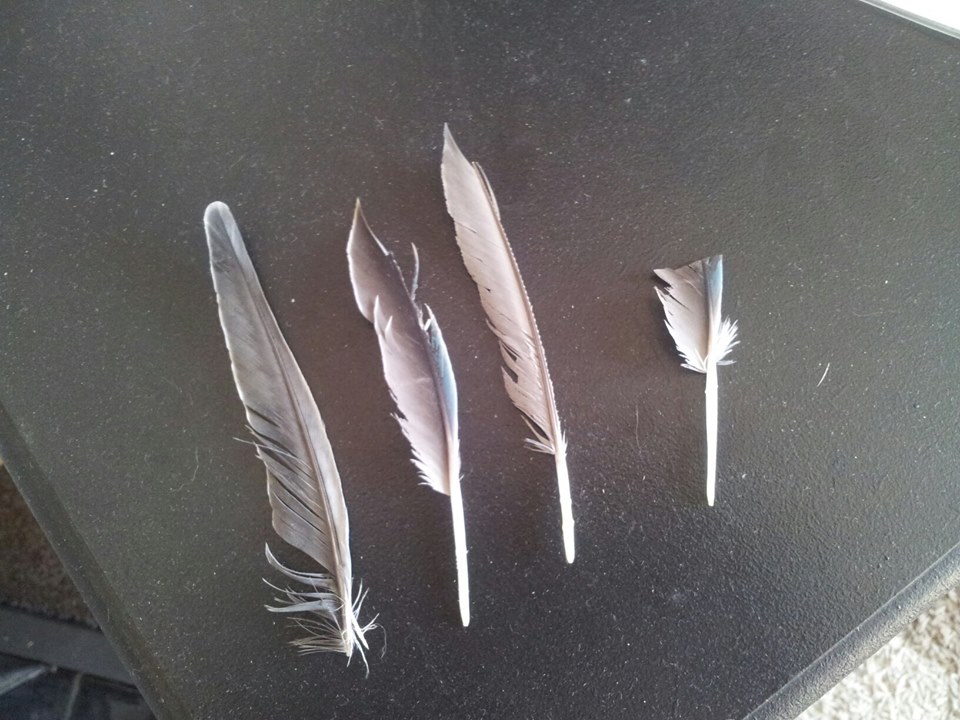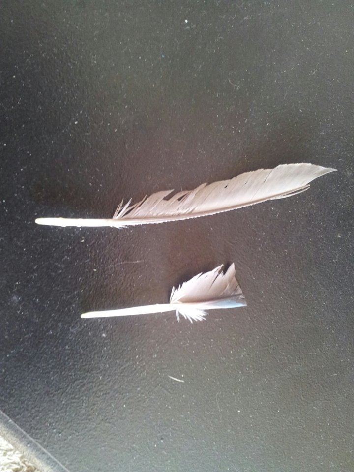 The first feather is one he bent in the cage and snipped off himself. The last one is the one which you can see has been clearly ‘cut’